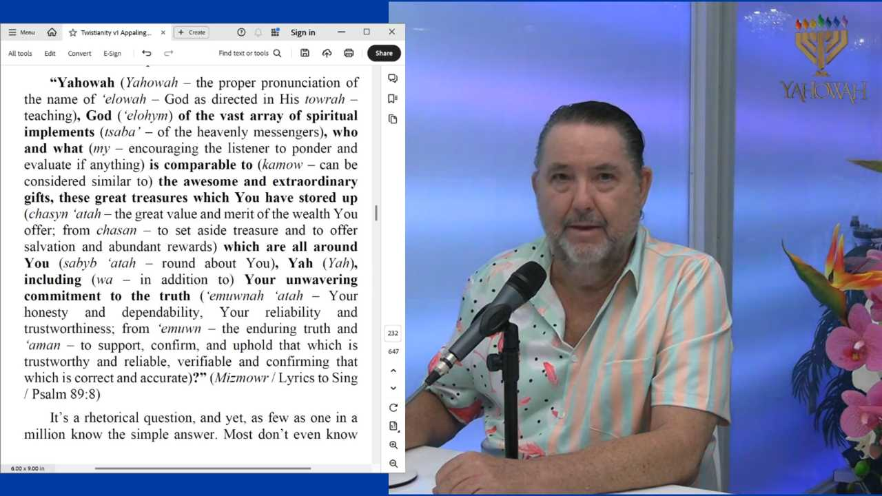 A Shabat Study of Yahowah's Torah. Join a group of Yah's family as we delve into the Towrah of God. We will expose religious corruption while more importantly espousing Yah's Torah truth. Hosted by the author of Yada Yahowah, An Introduction to God, Observations, Coming Home, Questioning Paul, God Damn Religion, and Tea with Terrorists.